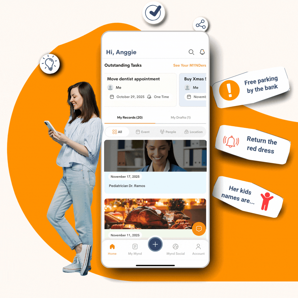 MYNDIFY™ supports text notes, photos, videos, voice notes, and file attachments. You can save anything — a gift idea you thought of in passing, a question you want to ask your doctor, a detail about a friend, a note about your last visit to a restaurant. If it’s worth remembering, MYNDIFY™ will hold it and bring it back when you need it.